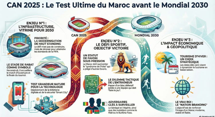 La CAN 2025 (21 déc. – 18 janv.) est plus qu’un tournoi pour le Maroc. Analyse des infrastructures, des retombées économiques et du défi sportif pour les Lions de l’Atlas.